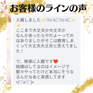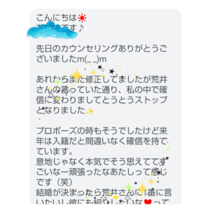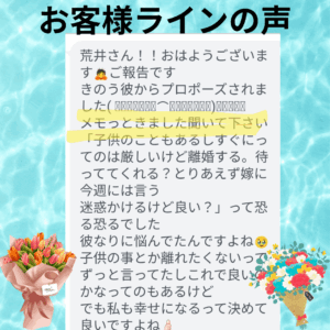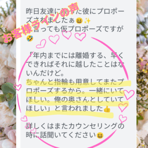 実際に、出会って1ヶ月以内でプロポーズされた方もいらっしゃいます。また、結婚してお子さんもいる男性が離婚を決断したケースもご報告いただいています。音信不通も最大6年以上連絡を取っていなかった方が彼から連絡が来た!と言う声も頂戴しています。